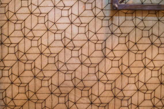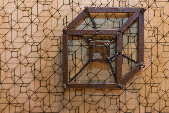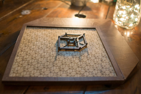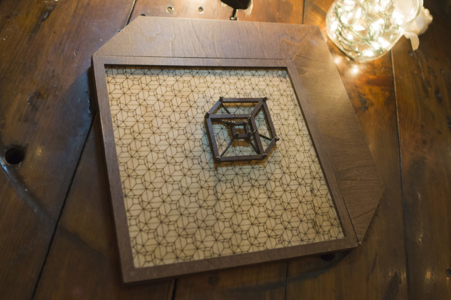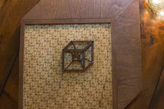 The inner tesseract design is made from stained and layered maple and held together with glossy black leather cord.
